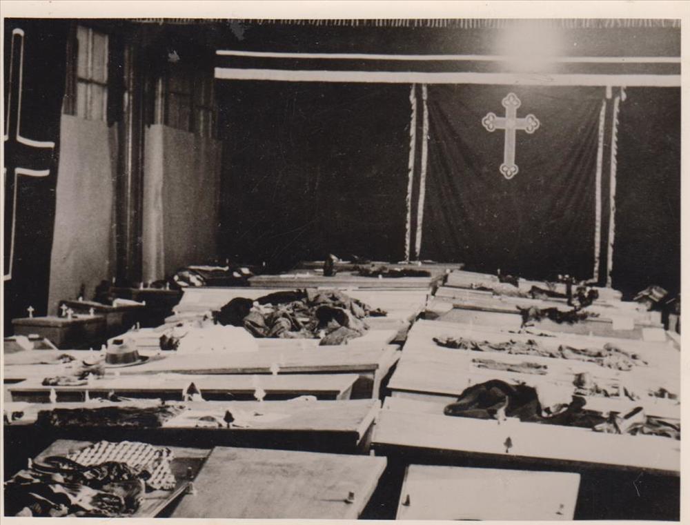 Foto van meerdere lijkkisten met daarop kledingstukk...