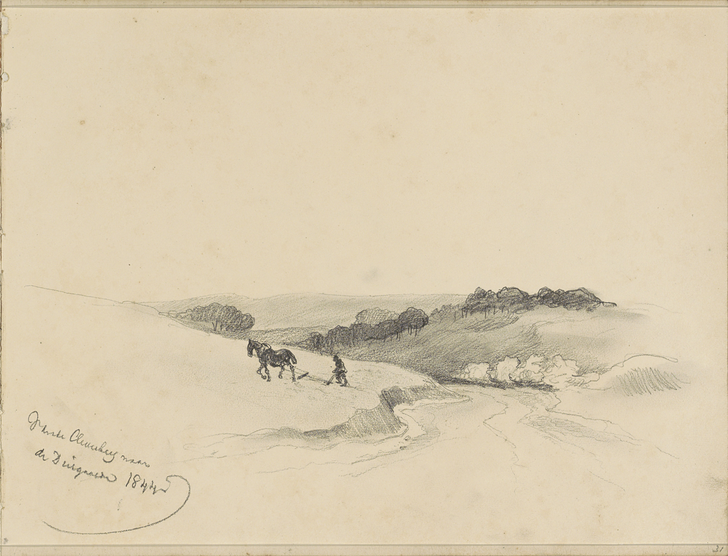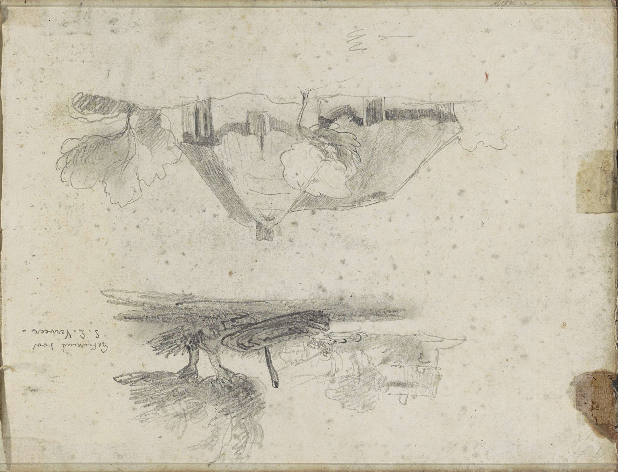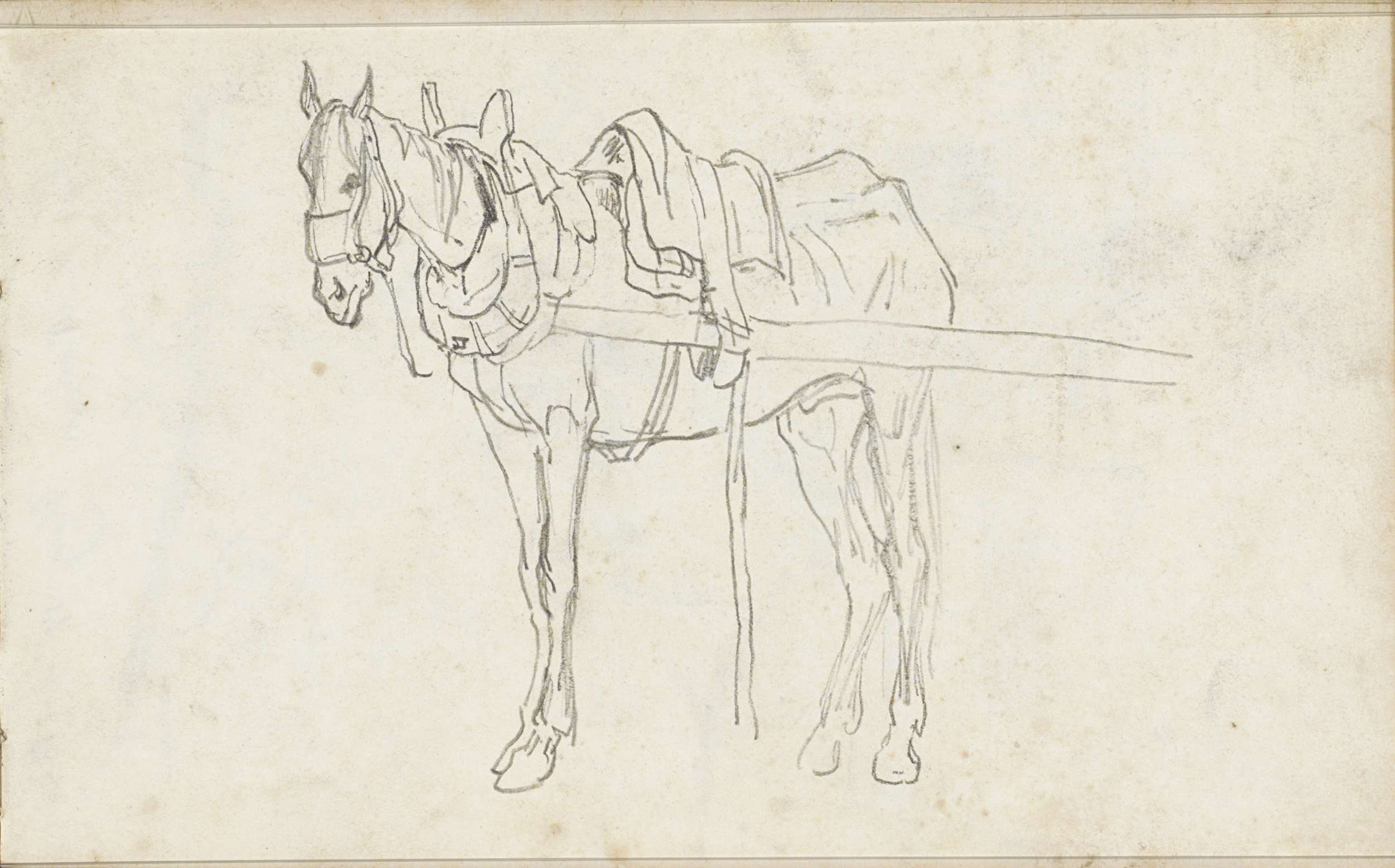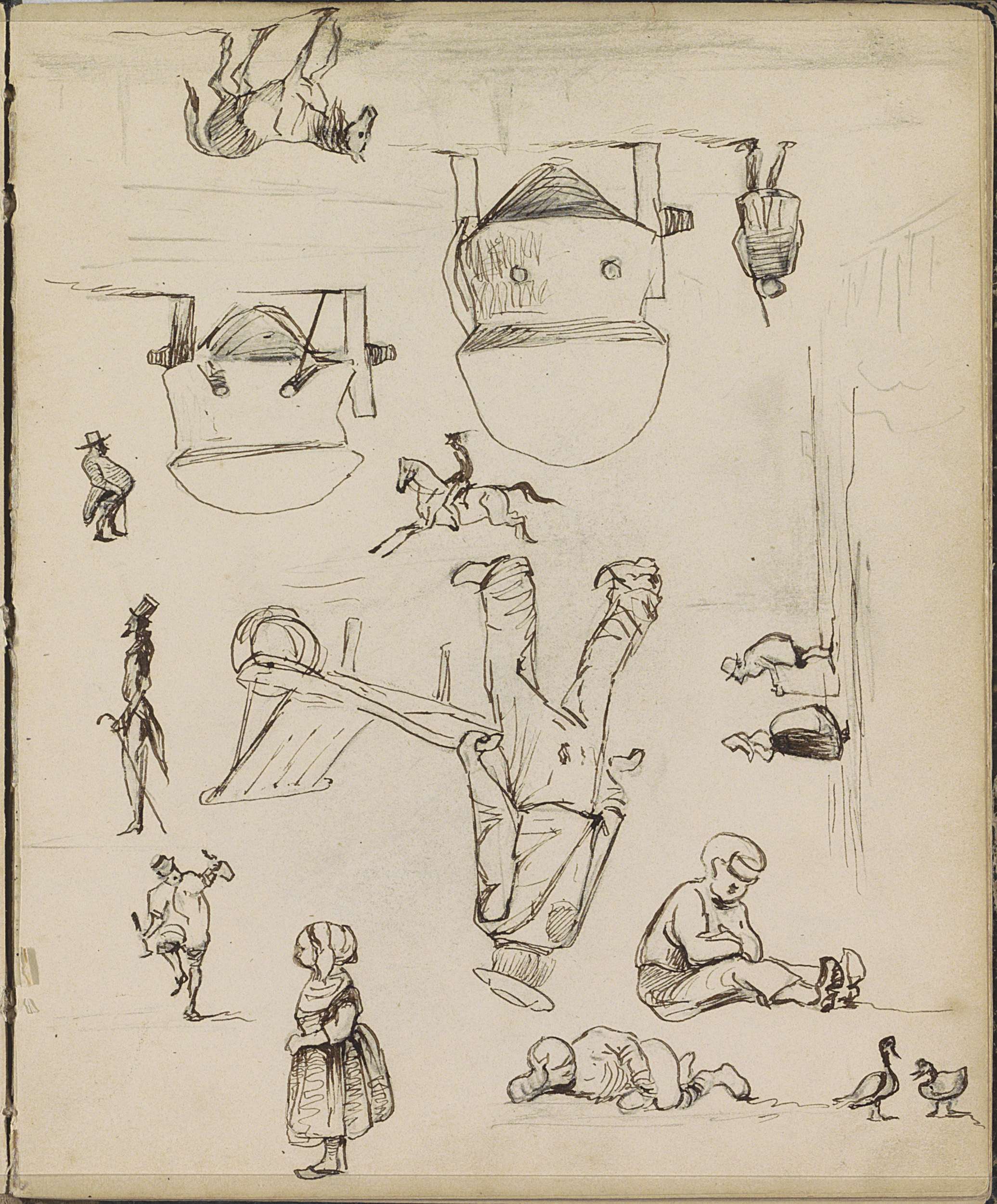 Studieblad, onder andere met een paard, ruiter en bo...