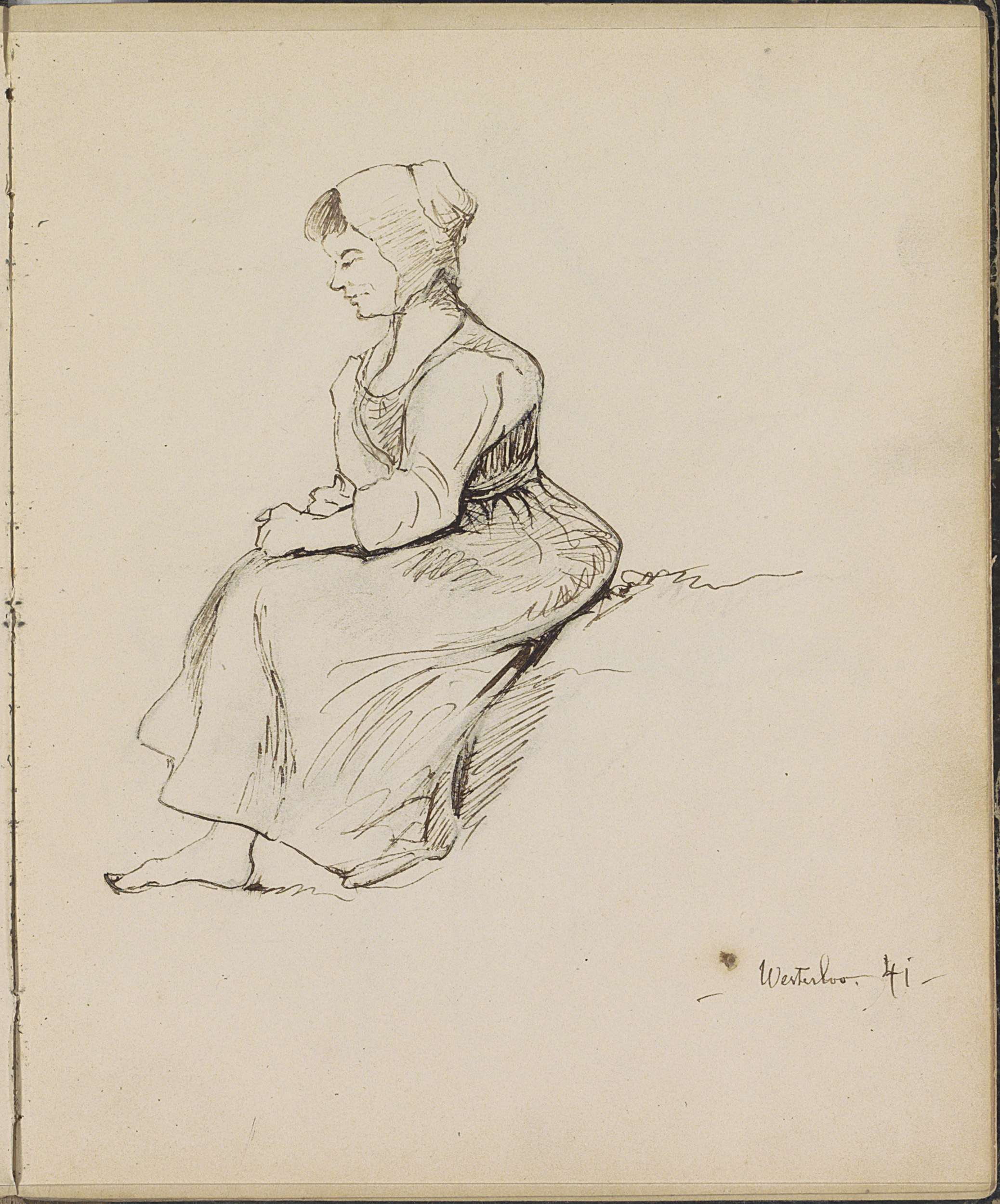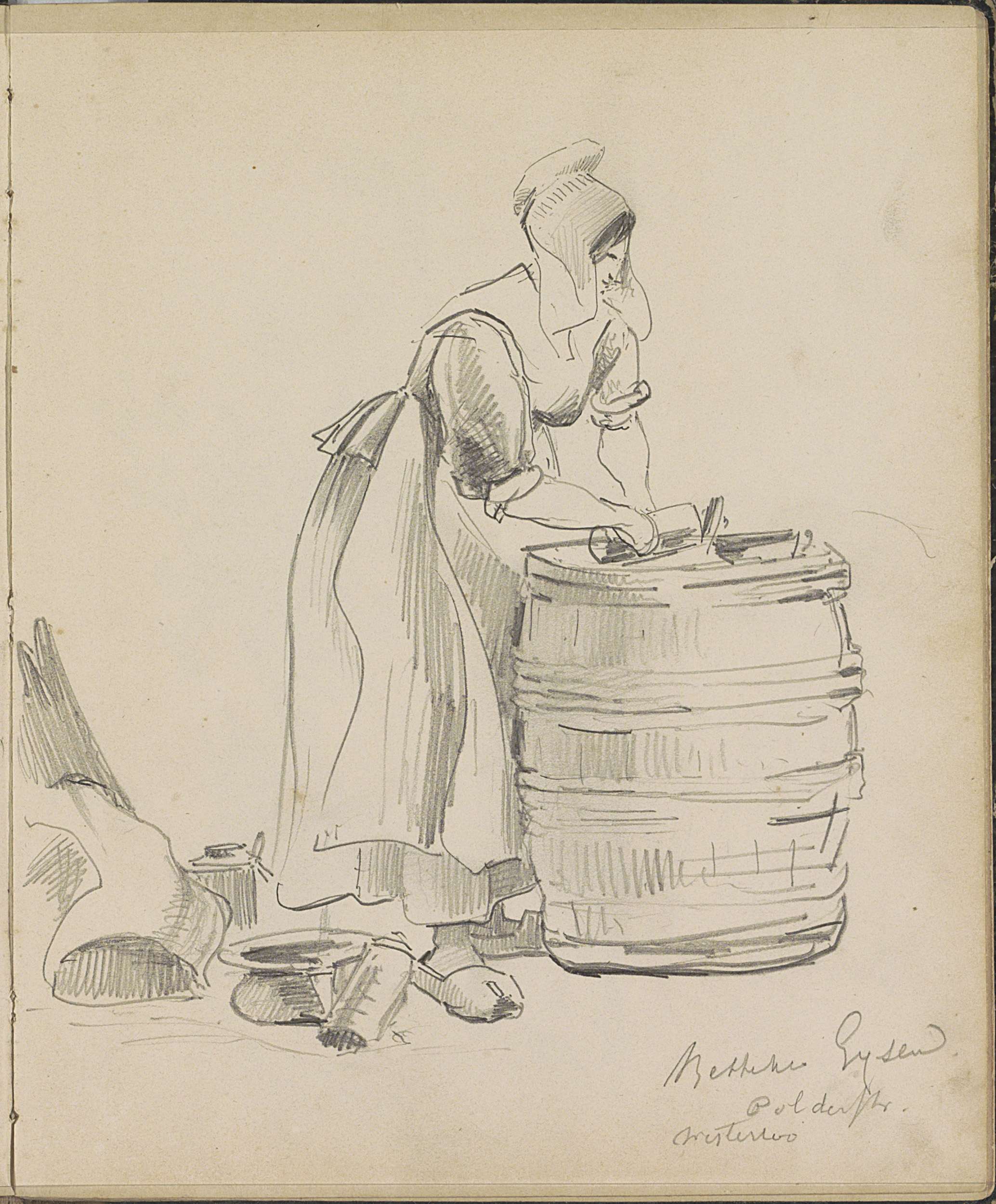 Vrouw met kap en schort, zittend bij een rieten mand