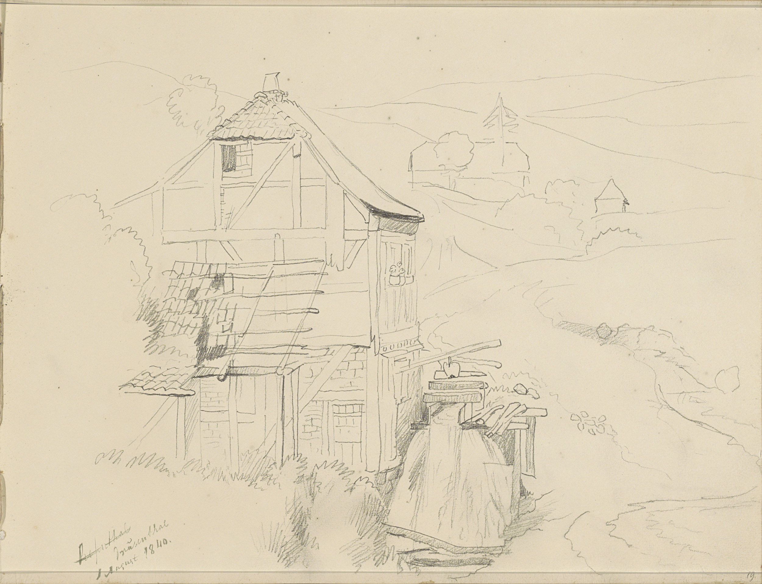 Vakwerkhuis aan een weg in een heuvellandschap