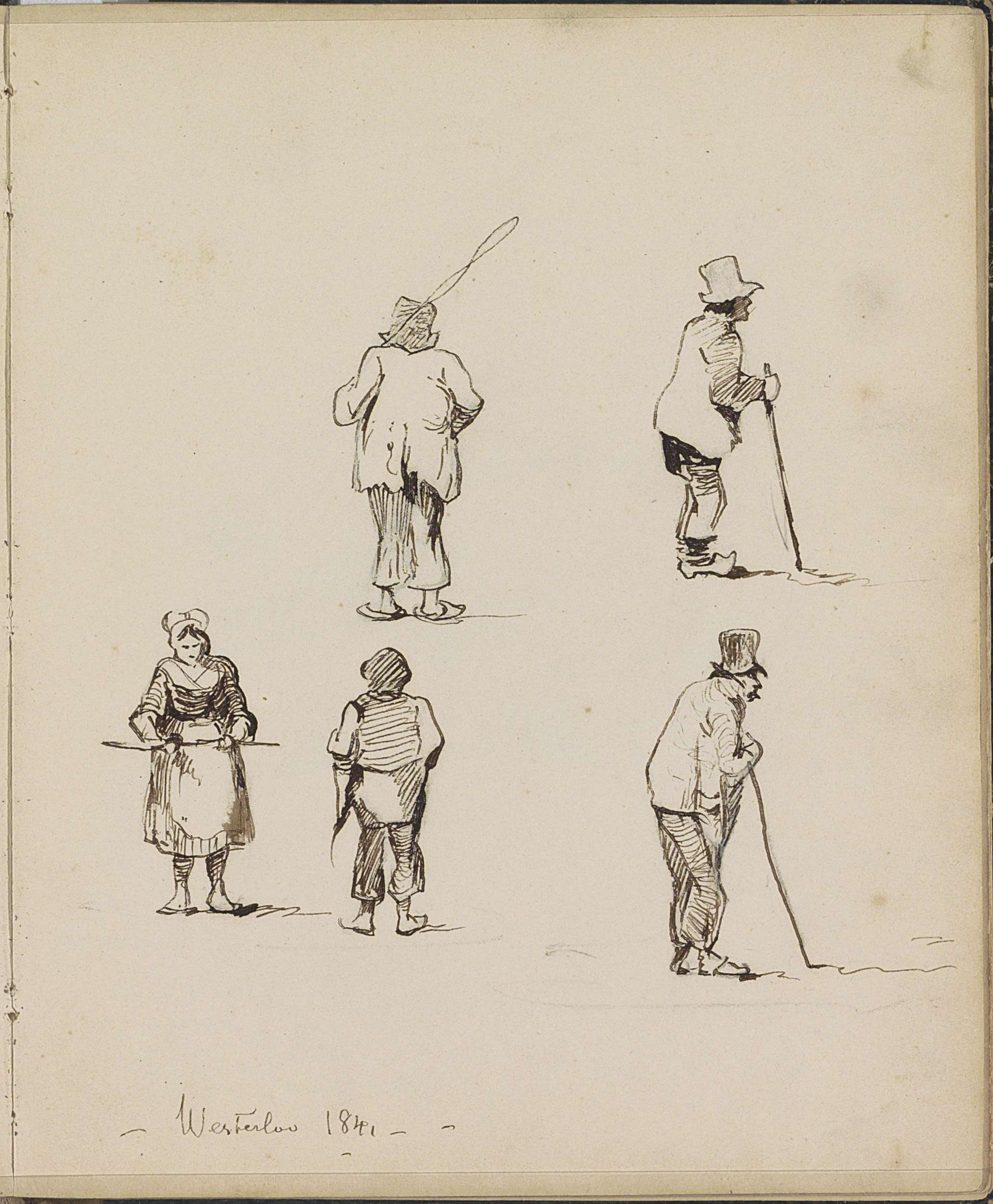 Boerin en mannen met hoge hoeden en wandelstokken