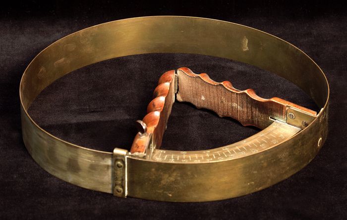 Ovaal meetinstrument van koper en hout, tussen twee ...