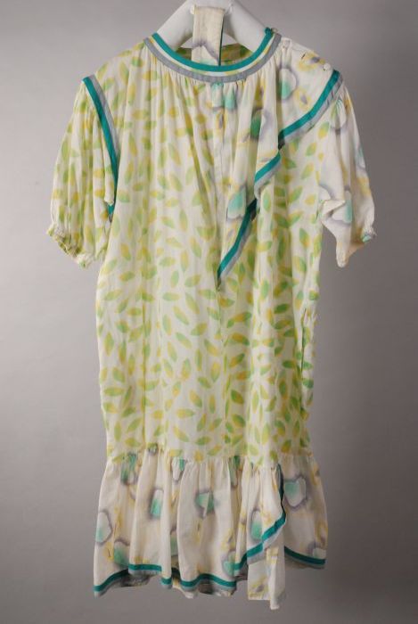 Witte wijde japon met groen-geel dessin en a-symmetr...