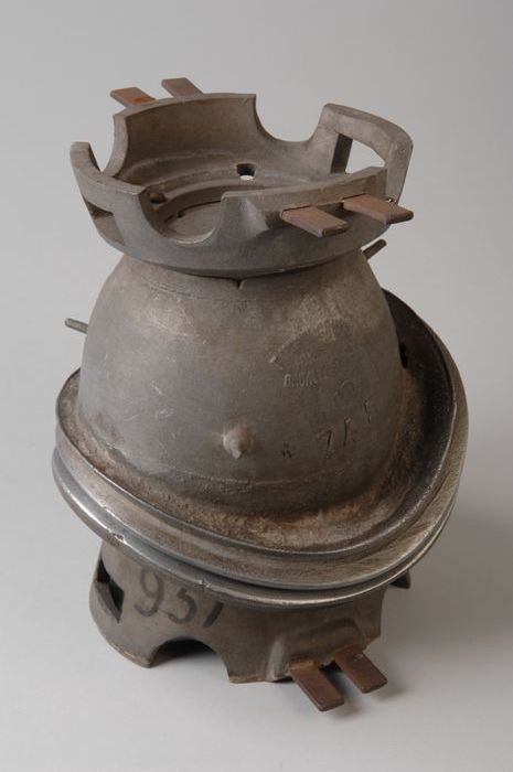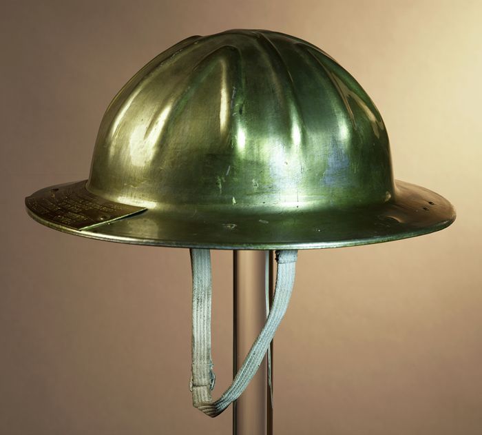 Metalen helm, gedragen bij slaan eerste paal "Zieken...