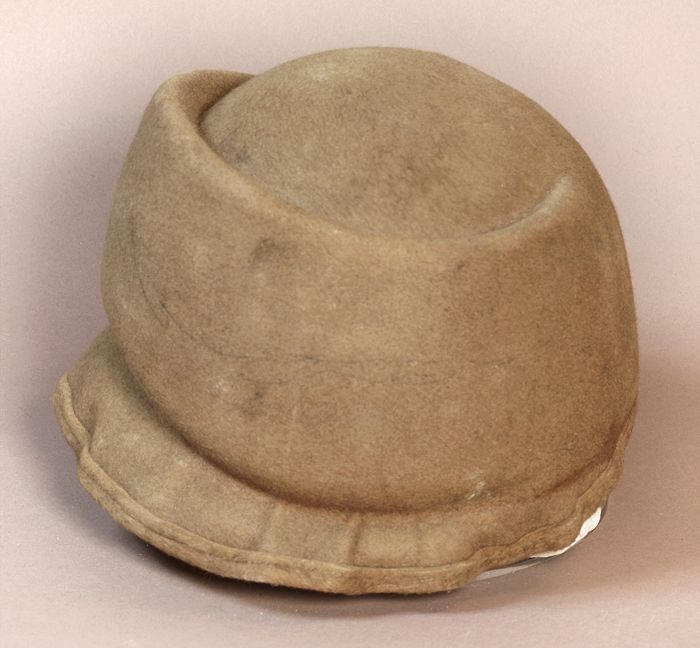 Hoedenmal van gips (A) overtrokken met beige haarvil...