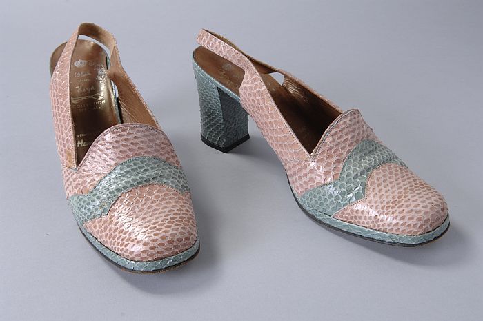 Roze en lichtblauwe slangenleren slingbacks met dunn...