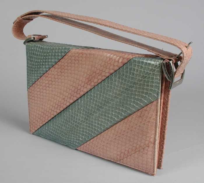 Schoudertas van roze en grijsgroen slangenleer om en...
