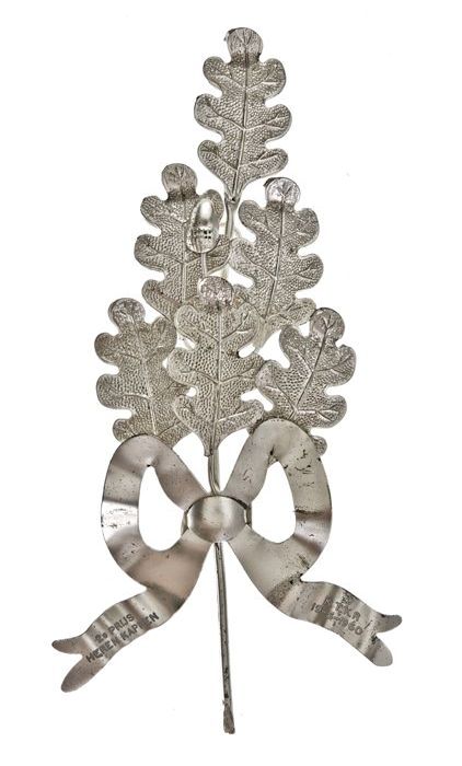 Trofee, zilverkleurig metalen eikenbladtak met strik...
