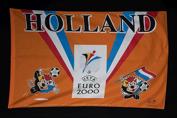 Oranje vlag met de logo's van Euro 2000 en opschrift...