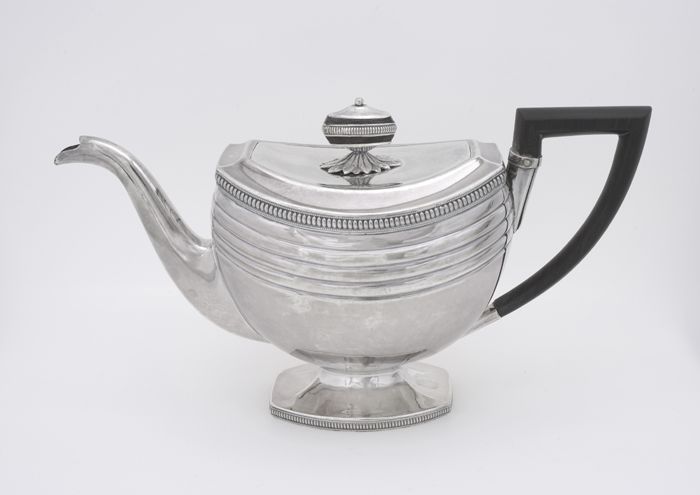 Vierdelig theeservies: zilveren theebus met deksel