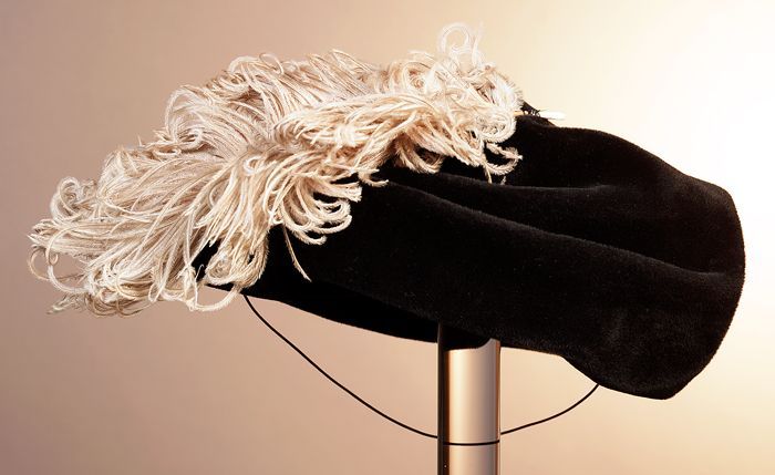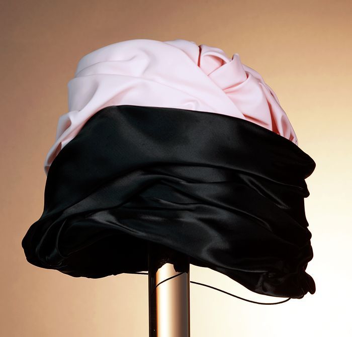Dameshoed van geplooide zwarte satijn en roze geploo...