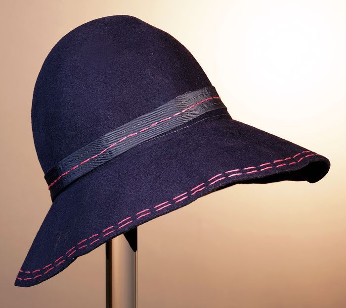 Dameshoed van donkerblauw vilt met hoge bol en brede...