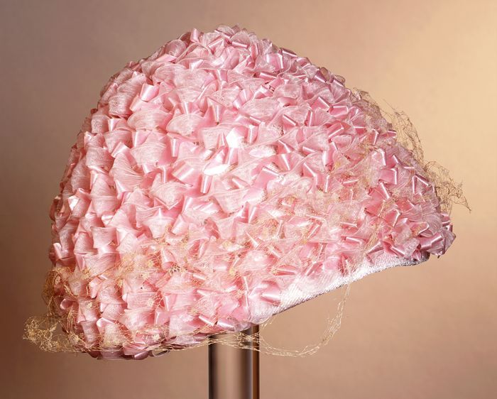 Ei-vormige hoed met twee soorten roze lint in kleine...