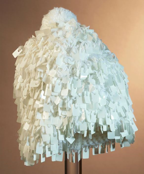 Witte gehaakte muts met ingebreide witte plastic rec...
