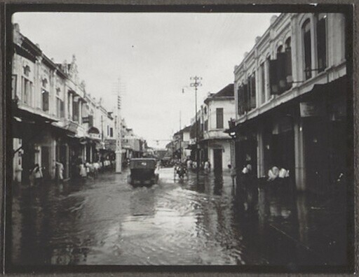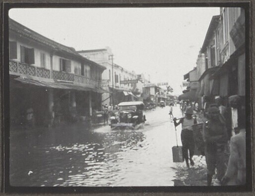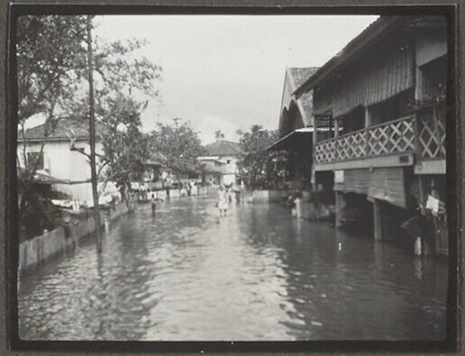 Ondergelopen straat in Palembang tijdens hoog water