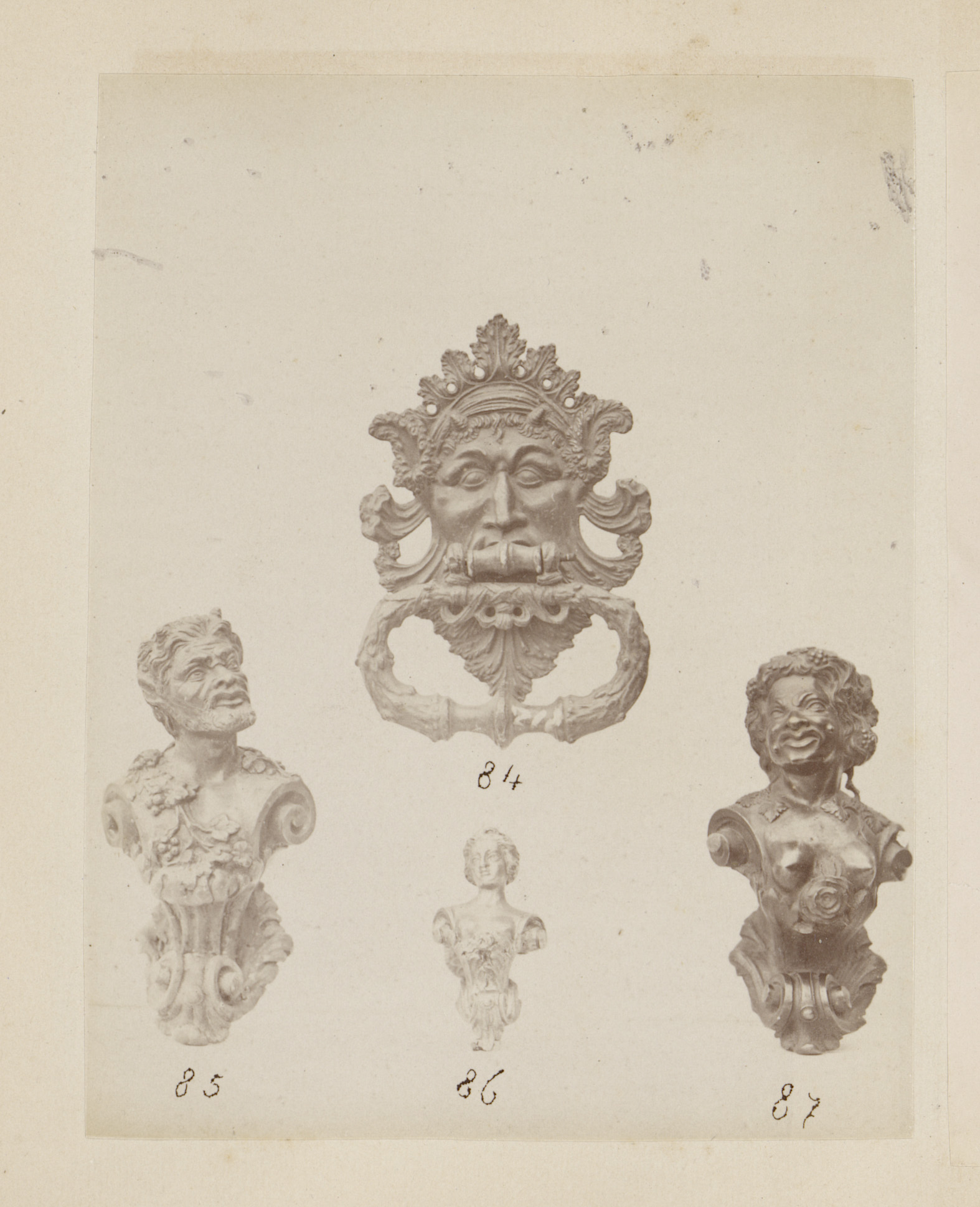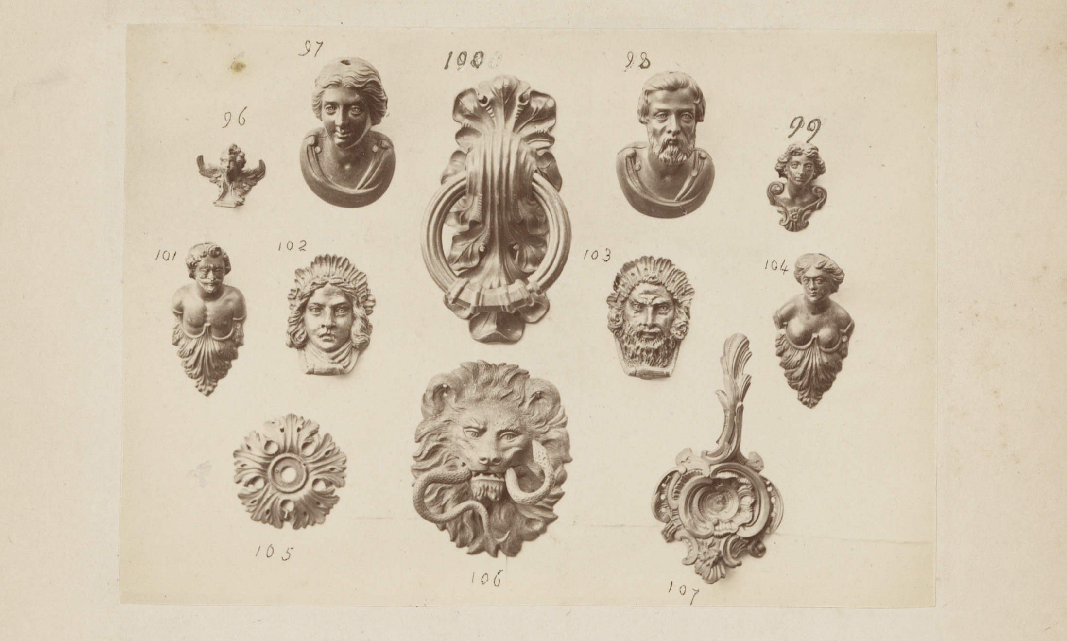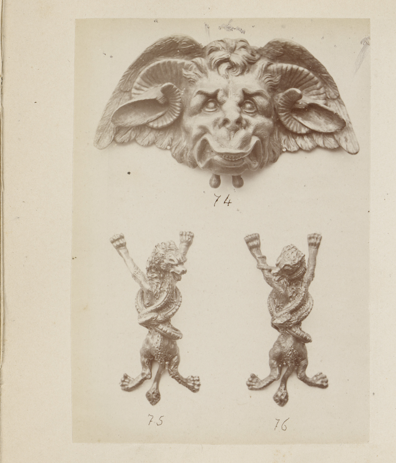Metalen ornamenten in de vorm van koppen en zeepaarden
