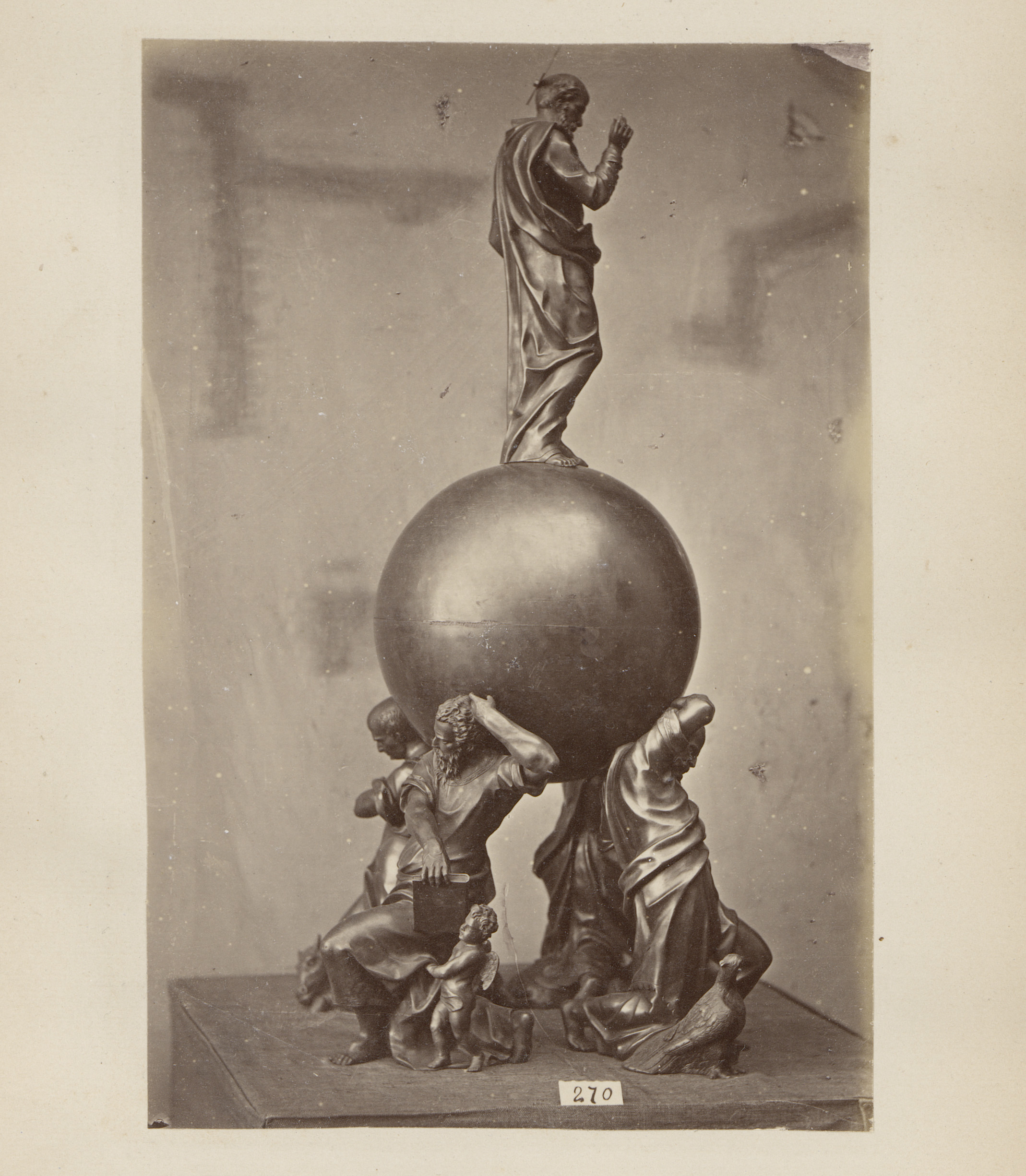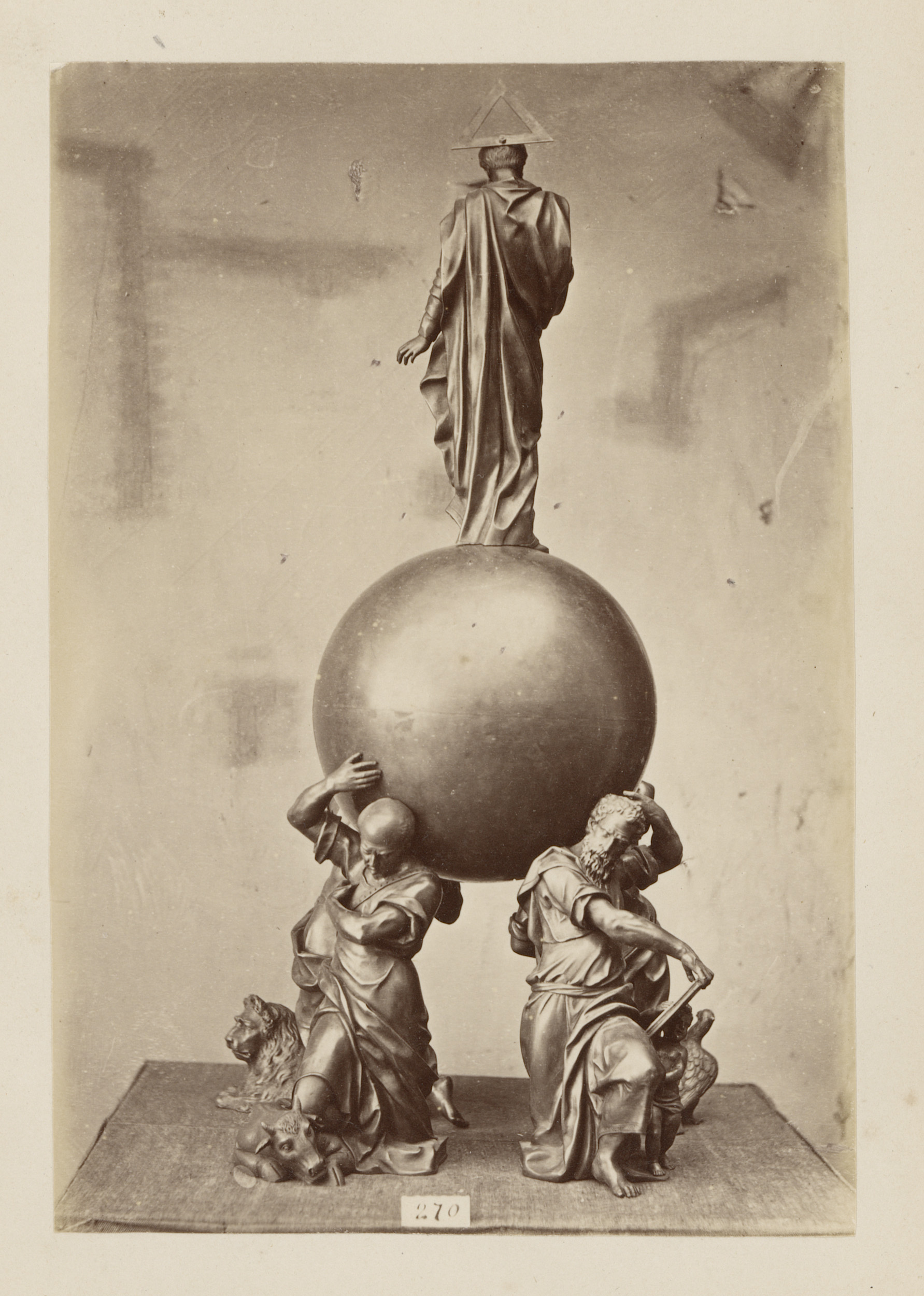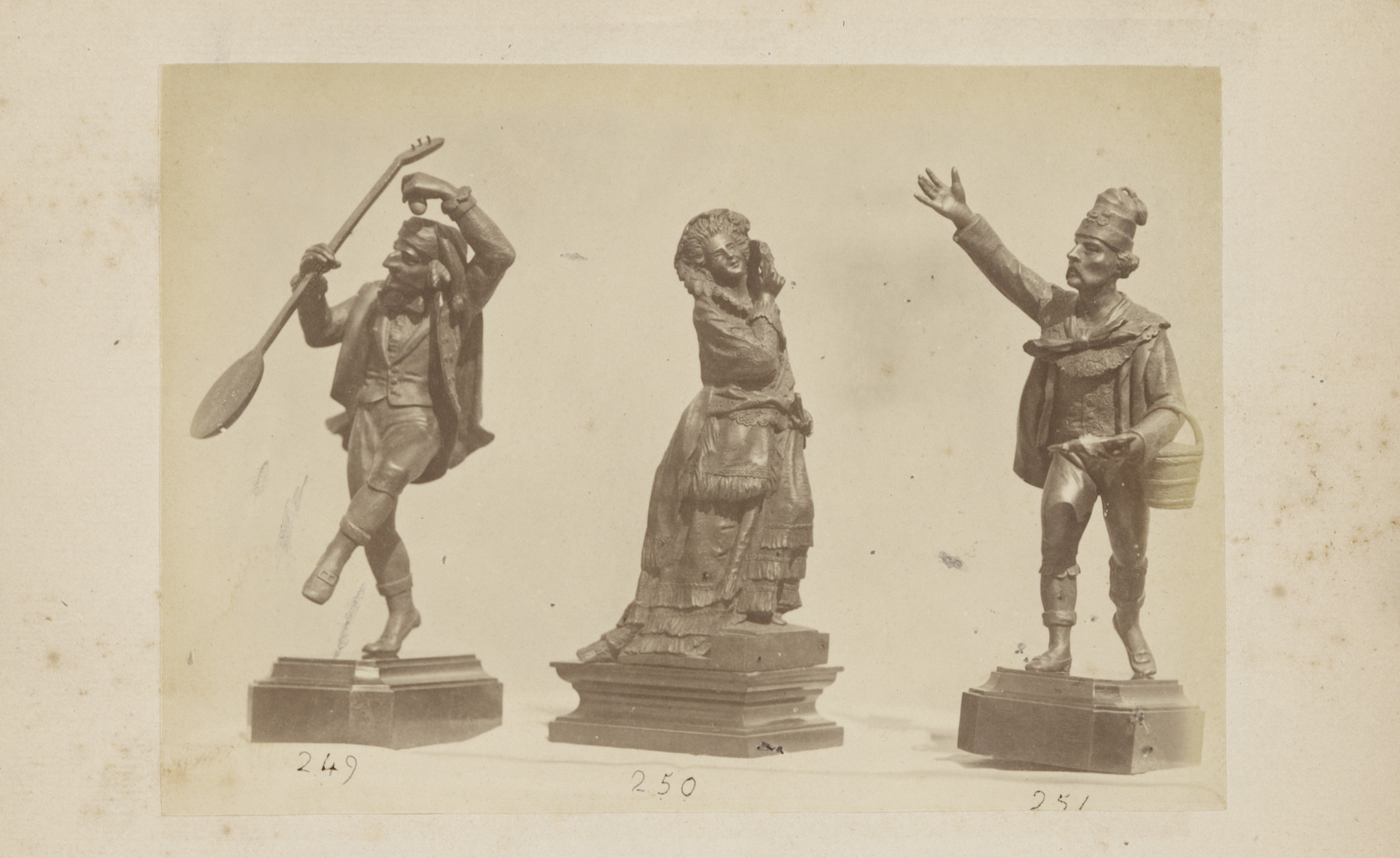 Metalen sculpturen van een sfinx en een naakt, een b...
