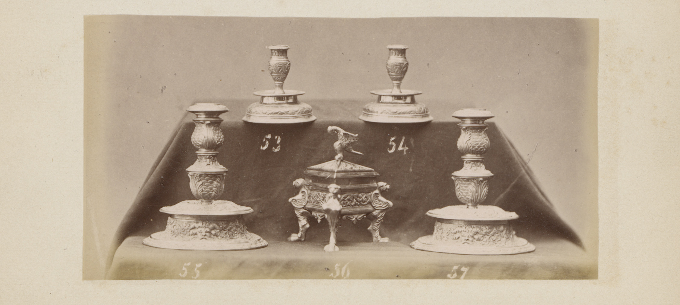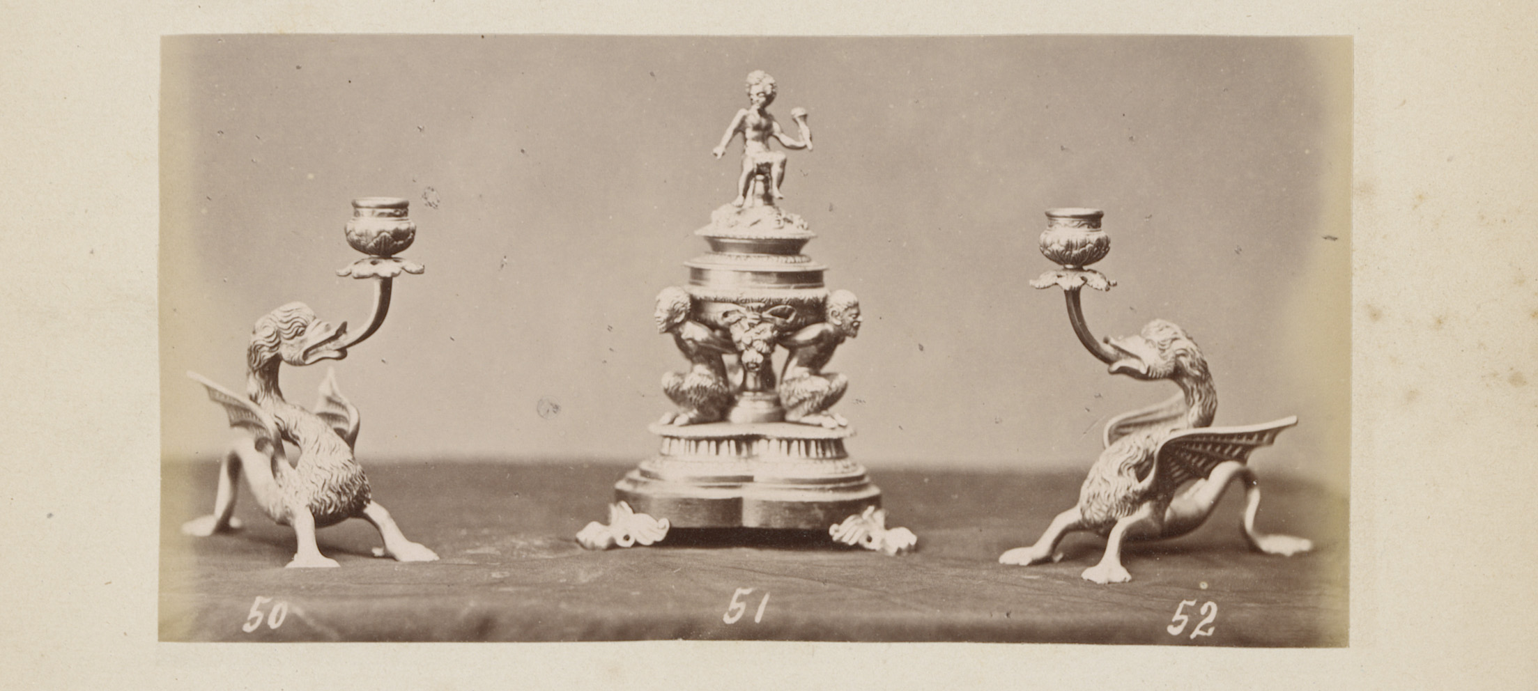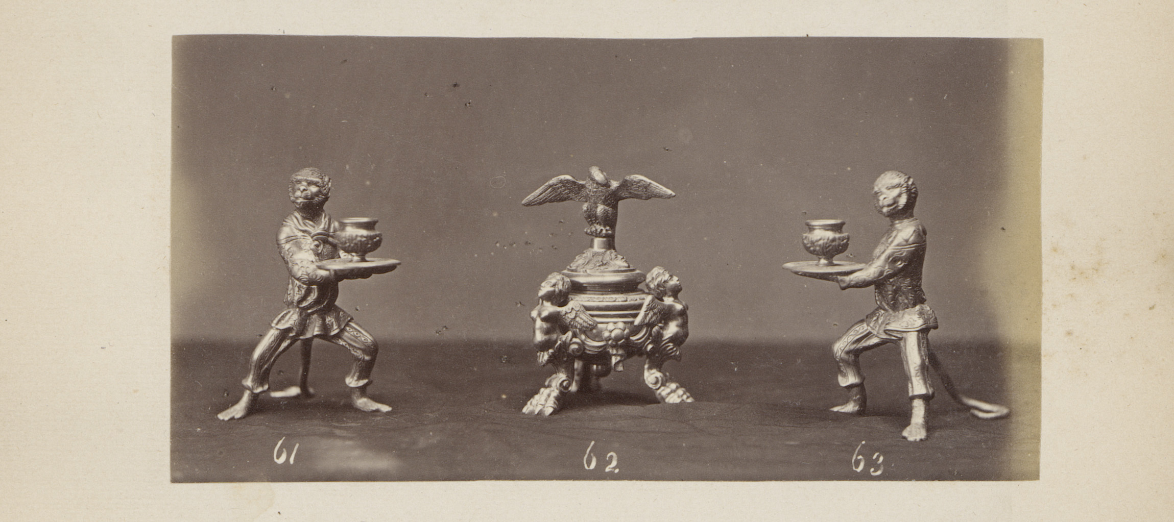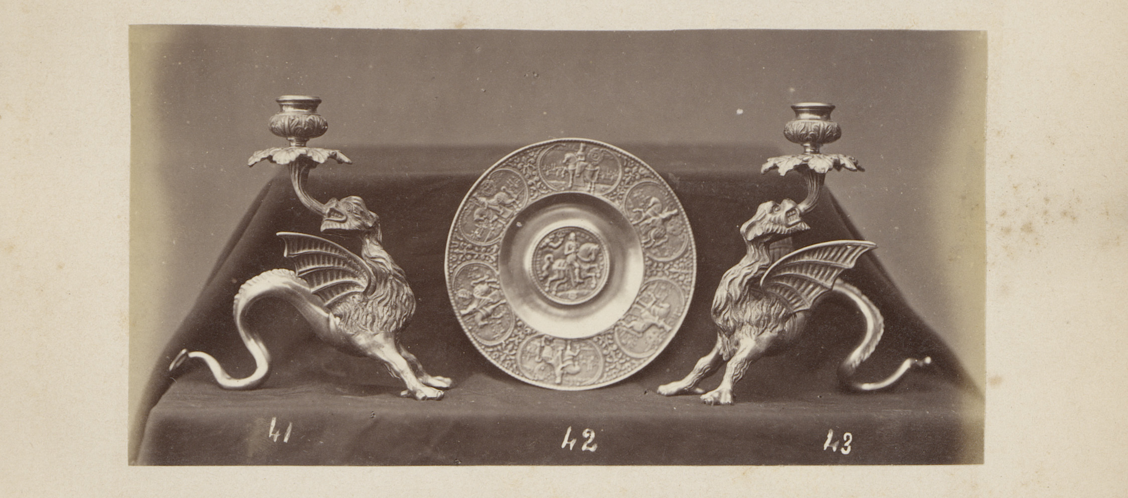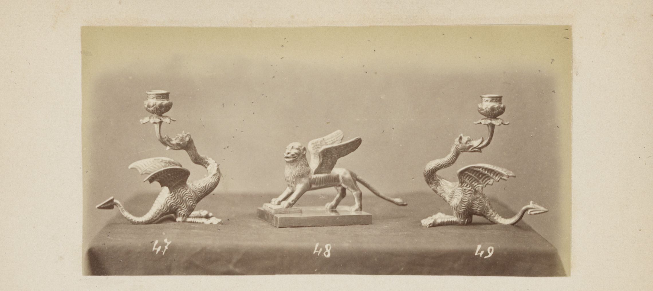 Metalen kandelaars in de vorm van griffioenen en leeuw