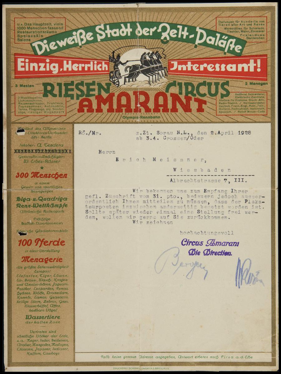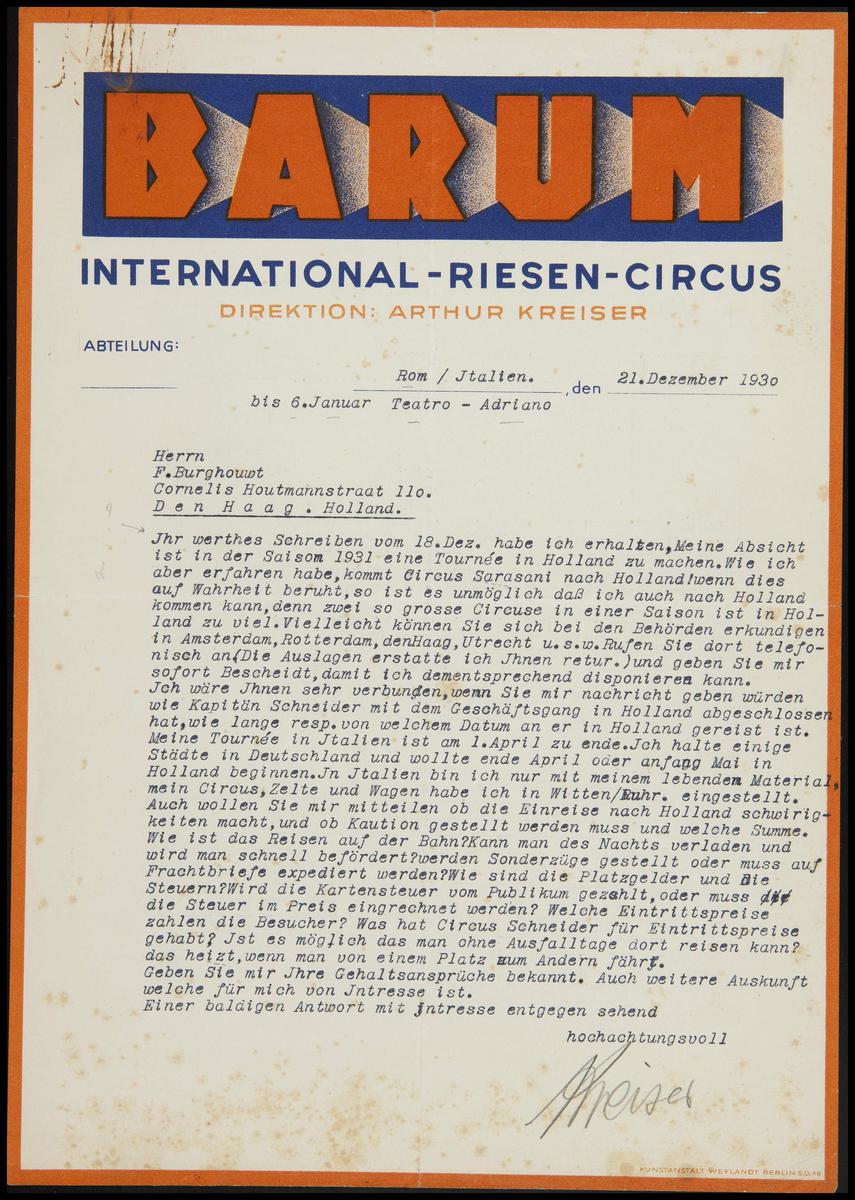 Brief Circus Barum aan Burghouwt betreffende tournee