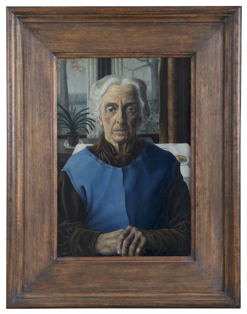 Oude vrouw in lang schort