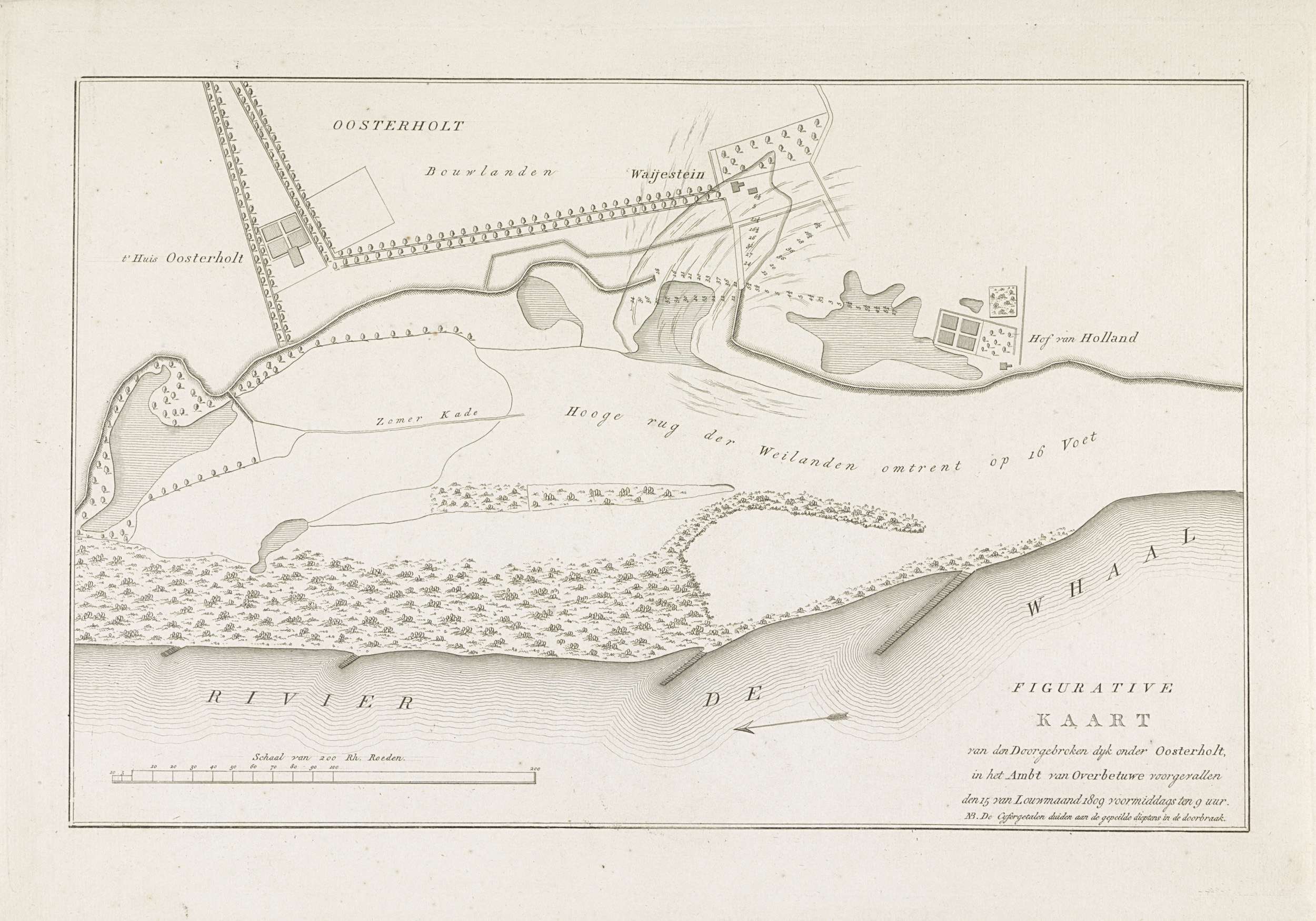 Kaart van dijkdoorbraak onder Oosterhout, 1809