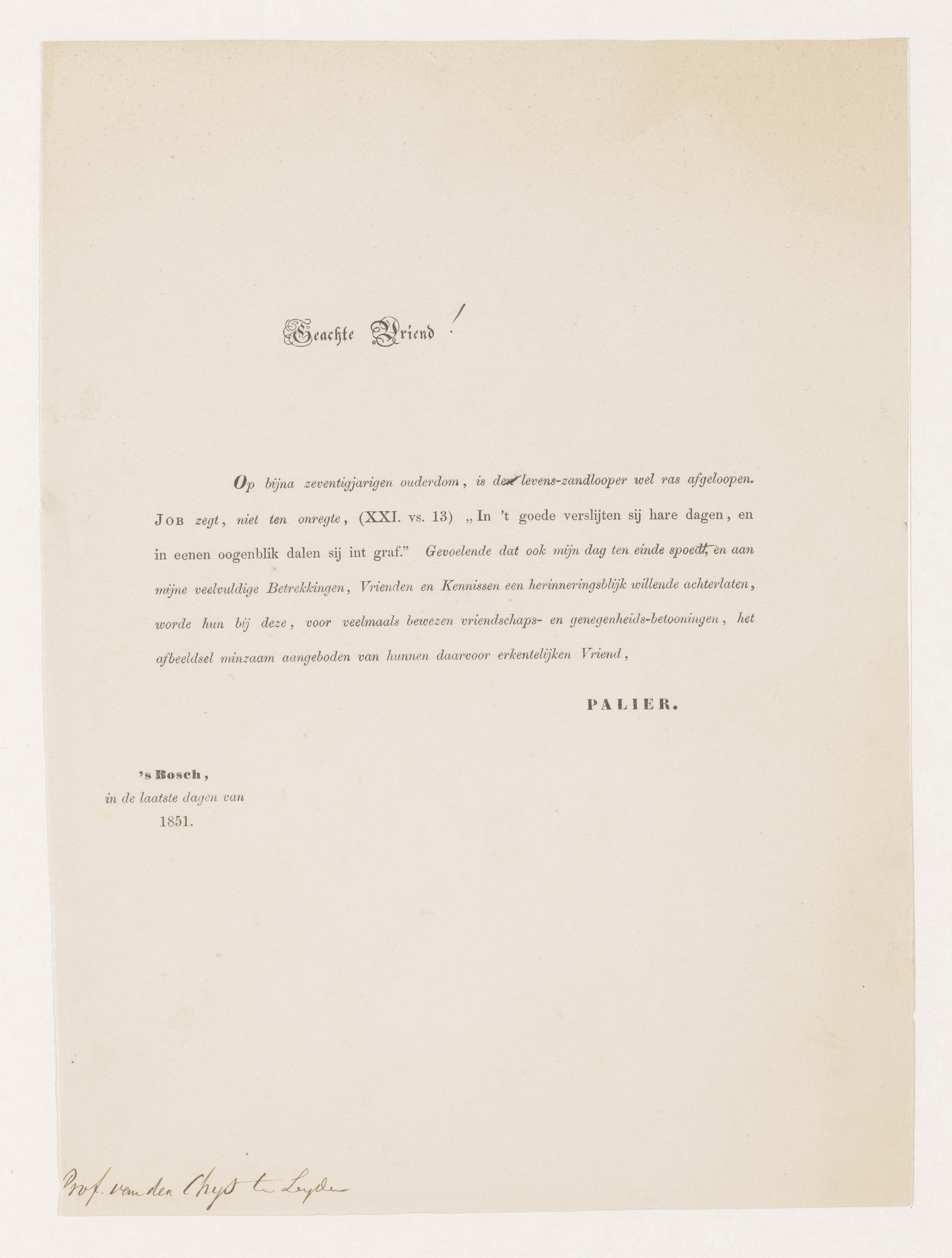 Brief bij portret van Hendrik Palier