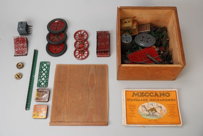 Houten kist met "Meccano" onderdelen en bijbehorende...