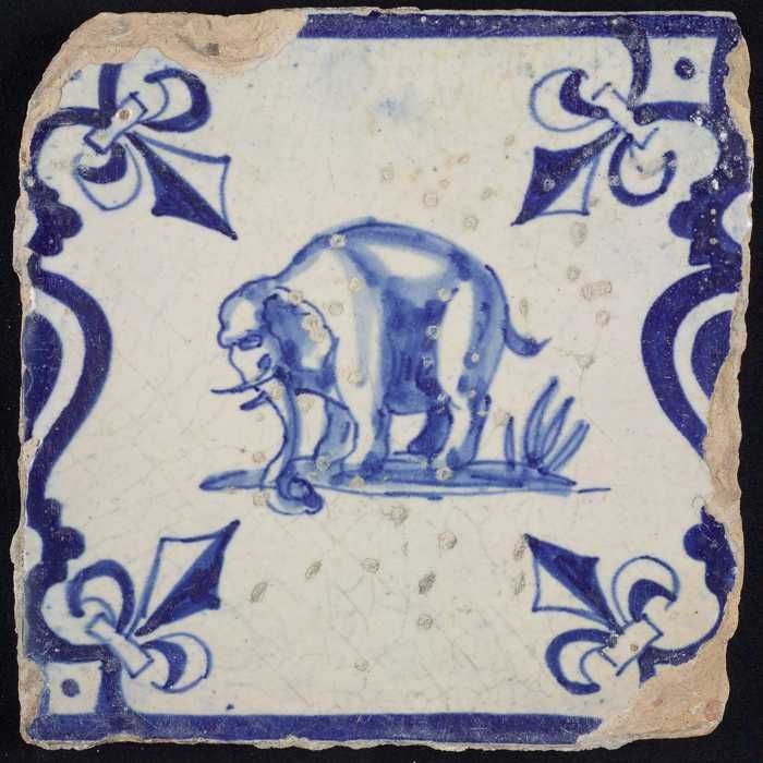 Dierentegel, staande olifant tussen balusters, hoekm...
