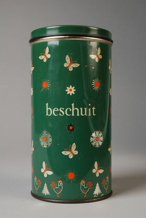 Cilindrisch groen De Spar beschuitblik, met oranje-w...