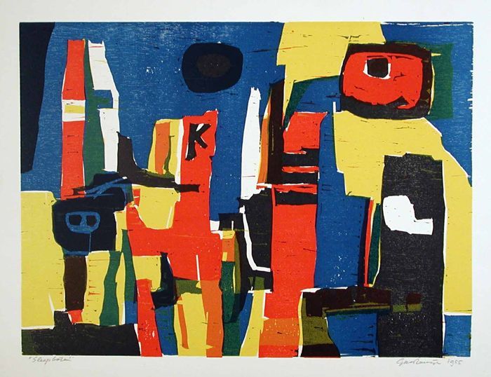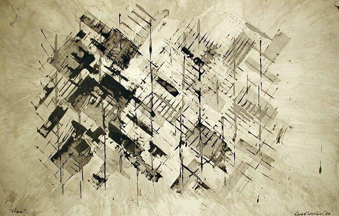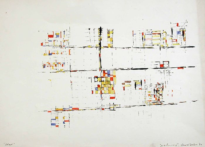 Aquarel getiteld "Stad", bestaande uit geabstraheerd...