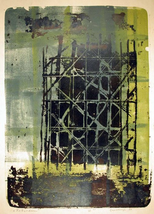 Kleurenlitho getiteld "Rotterdam", tegen blauw-groen...