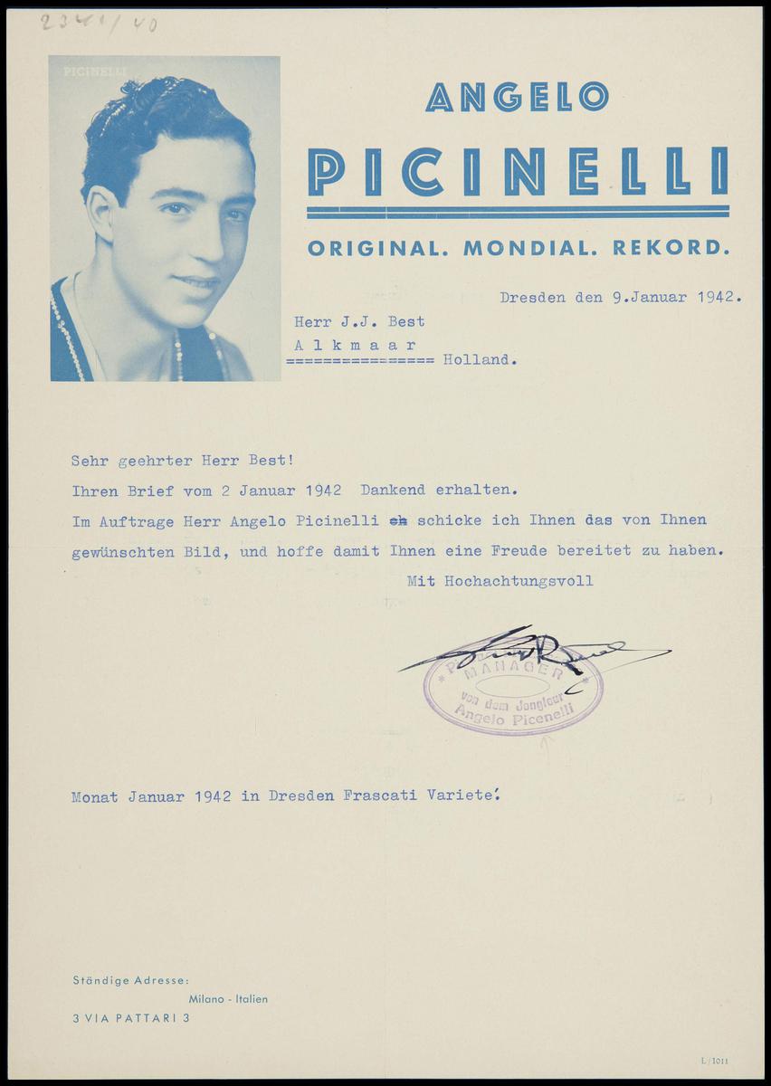 Brief en briefpapier van Angelo Picinelli, artiest, ...