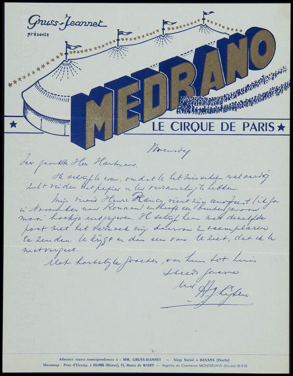 Brief Circus Medrano (Gruss-Jeannet) aan Hartmans