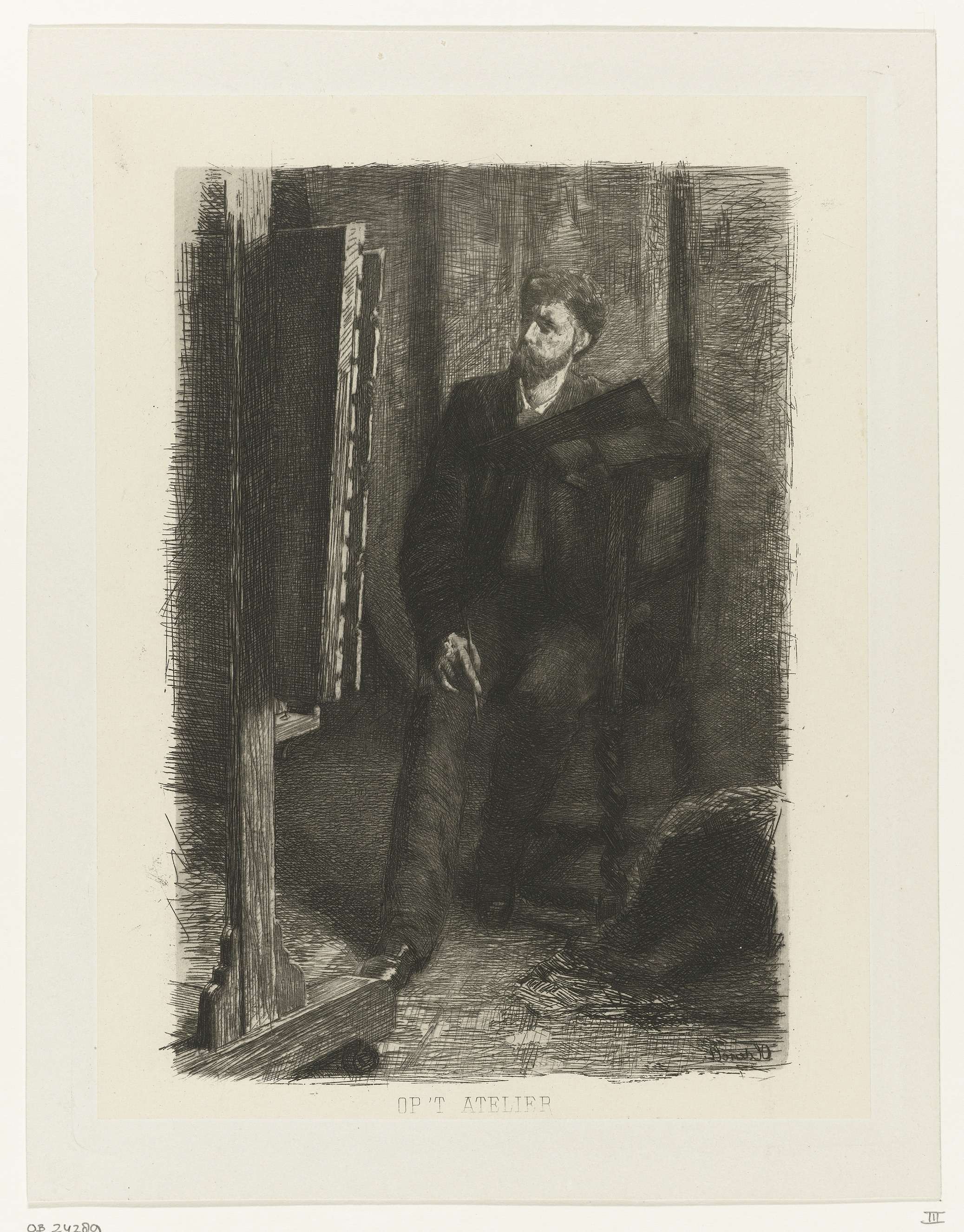 Portret van een kunstenaar staand achter de ezel