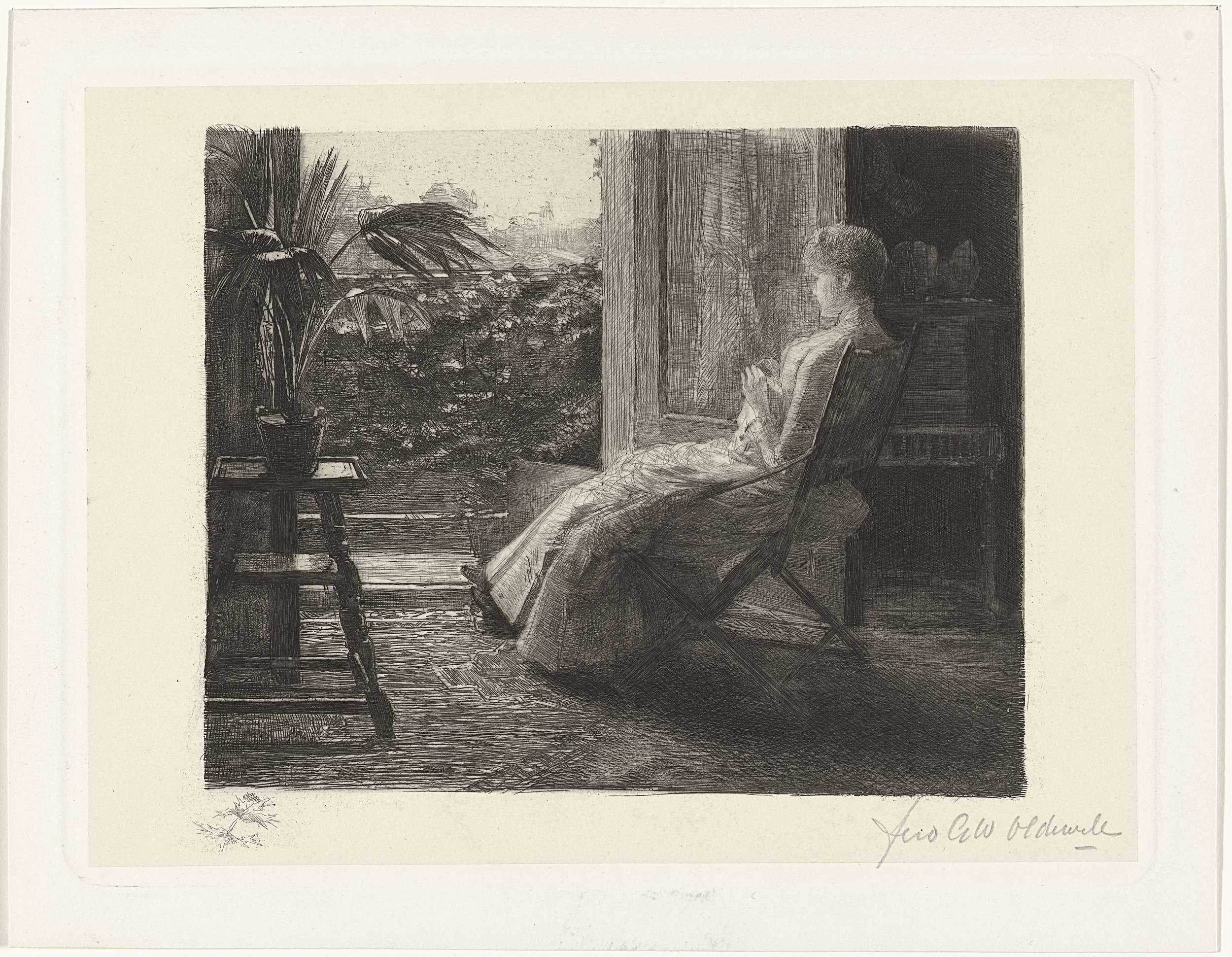 Jonge vrouw, bordurend, bij het open raam