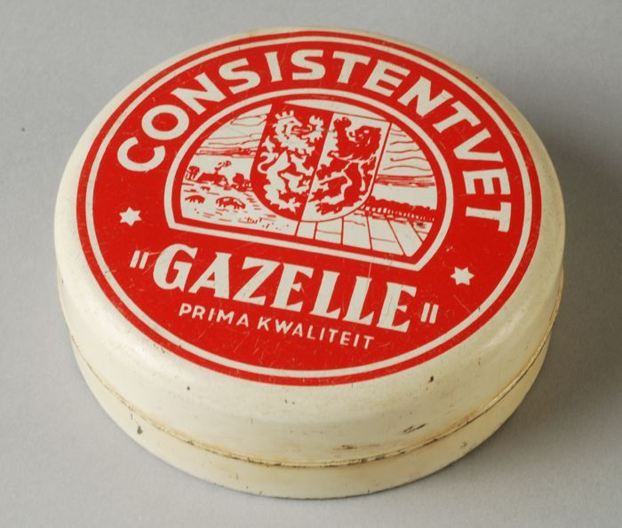 Cilindrisch rood en wit blik, met los deksel, waarop...