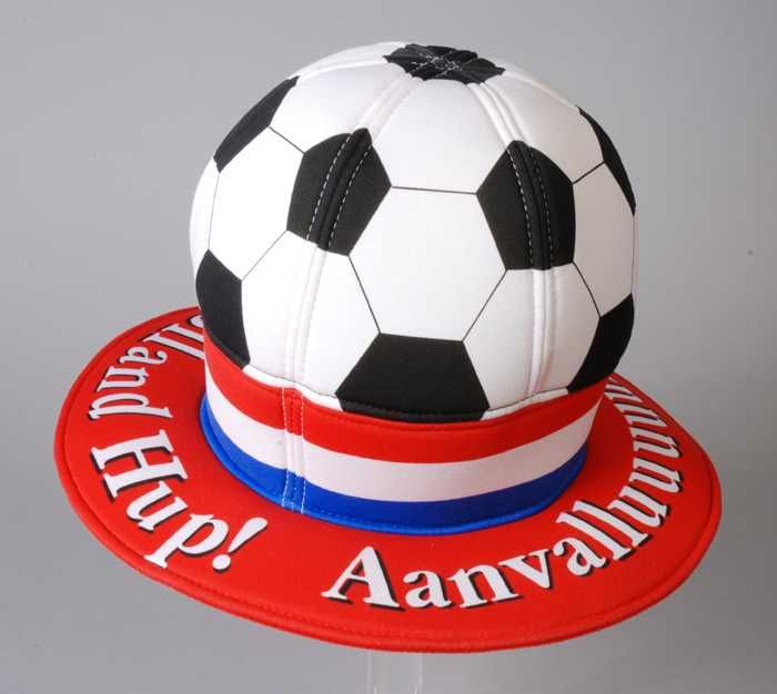 Hoed in de vorm van een voetbal, met "Aanvalluuuuuh!...