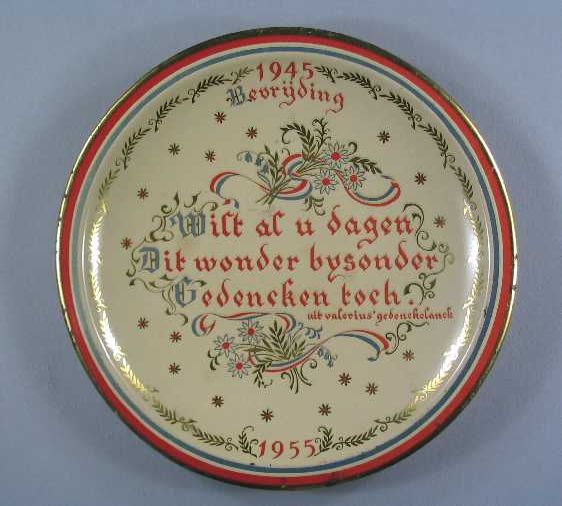 Rond blikken schaaltje, goudkleurig randje, rood-wit...