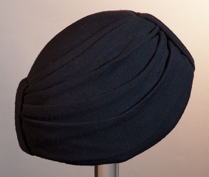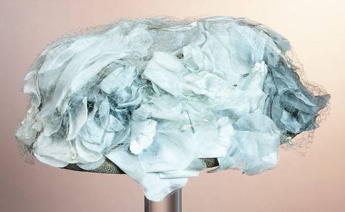 Ronde toque, basis van grijs linnen, bedekt met wit ...