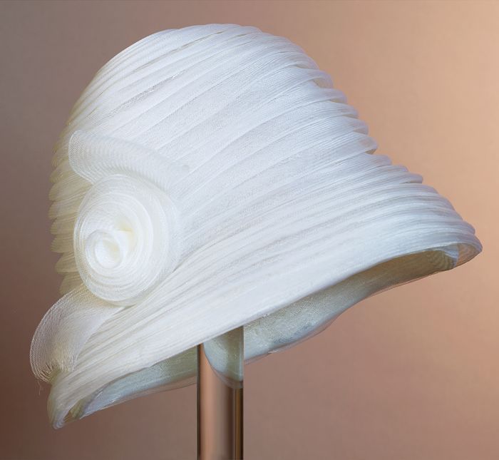 Ronde cloche, geheel van wit crin-band, gevouwen en ...