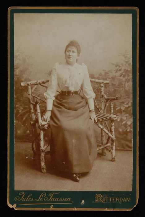 Foto van Marie van Eysden-Vink; dame naast stoel waa...