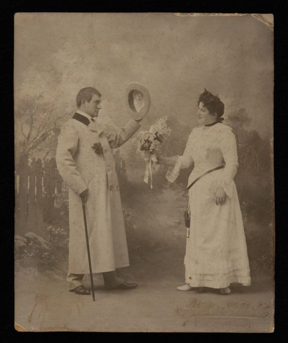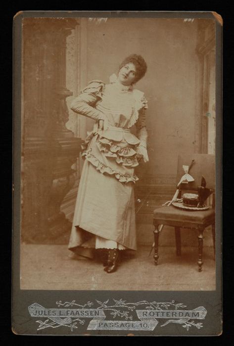 Foto van actrice Marie van Eysden-Vink; heer met hoe...