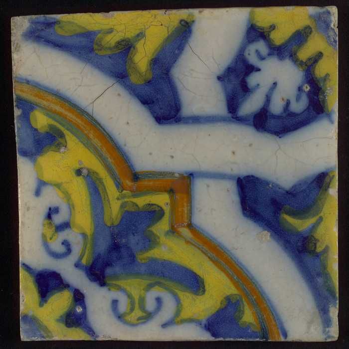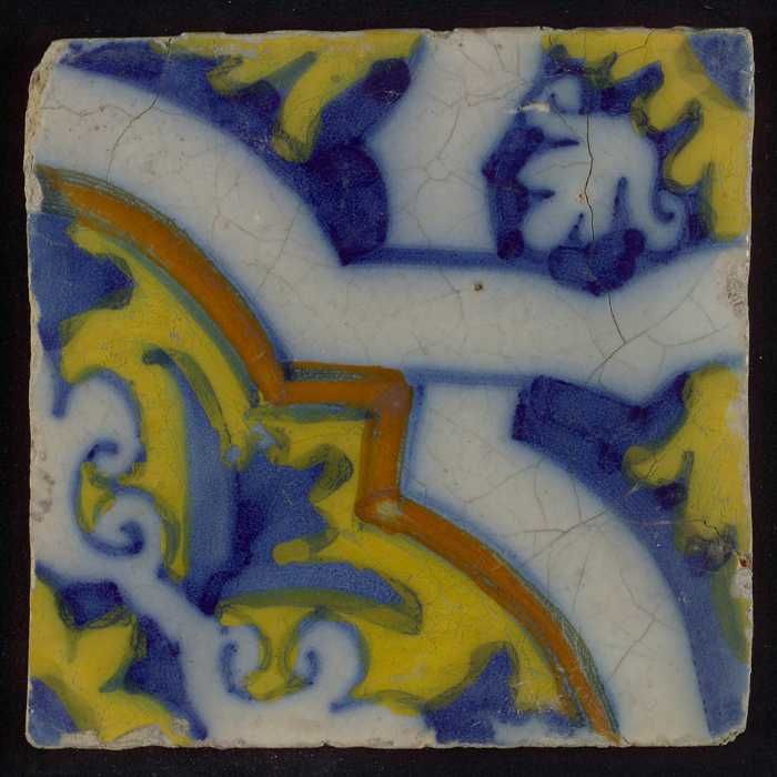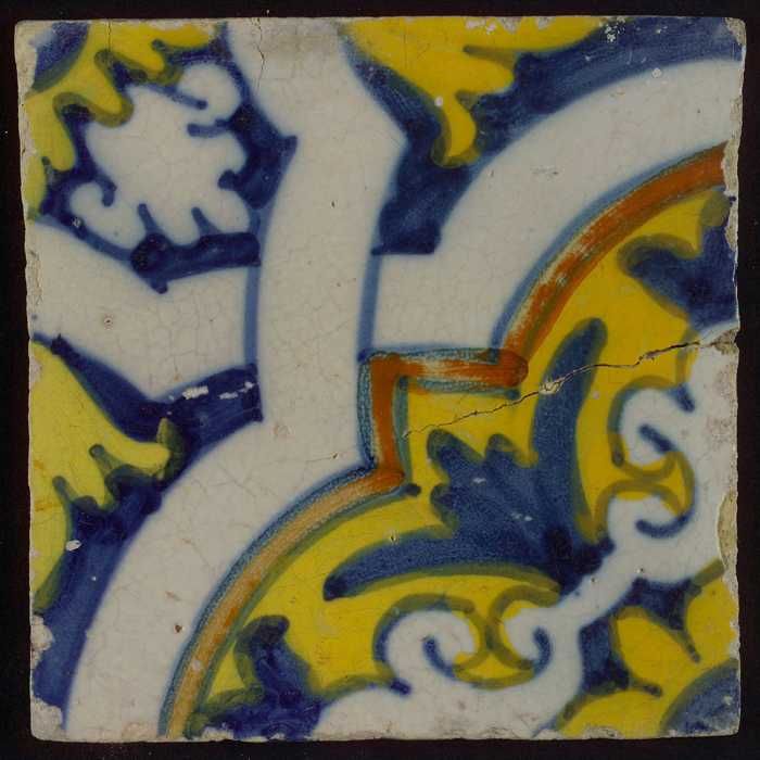 Ornamenttegel, diagonaal over de tegel een wit vlech...