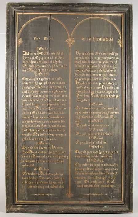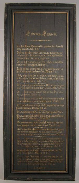 Tekstpaneel met bijbelcitaten ("De Wet des Heeren")