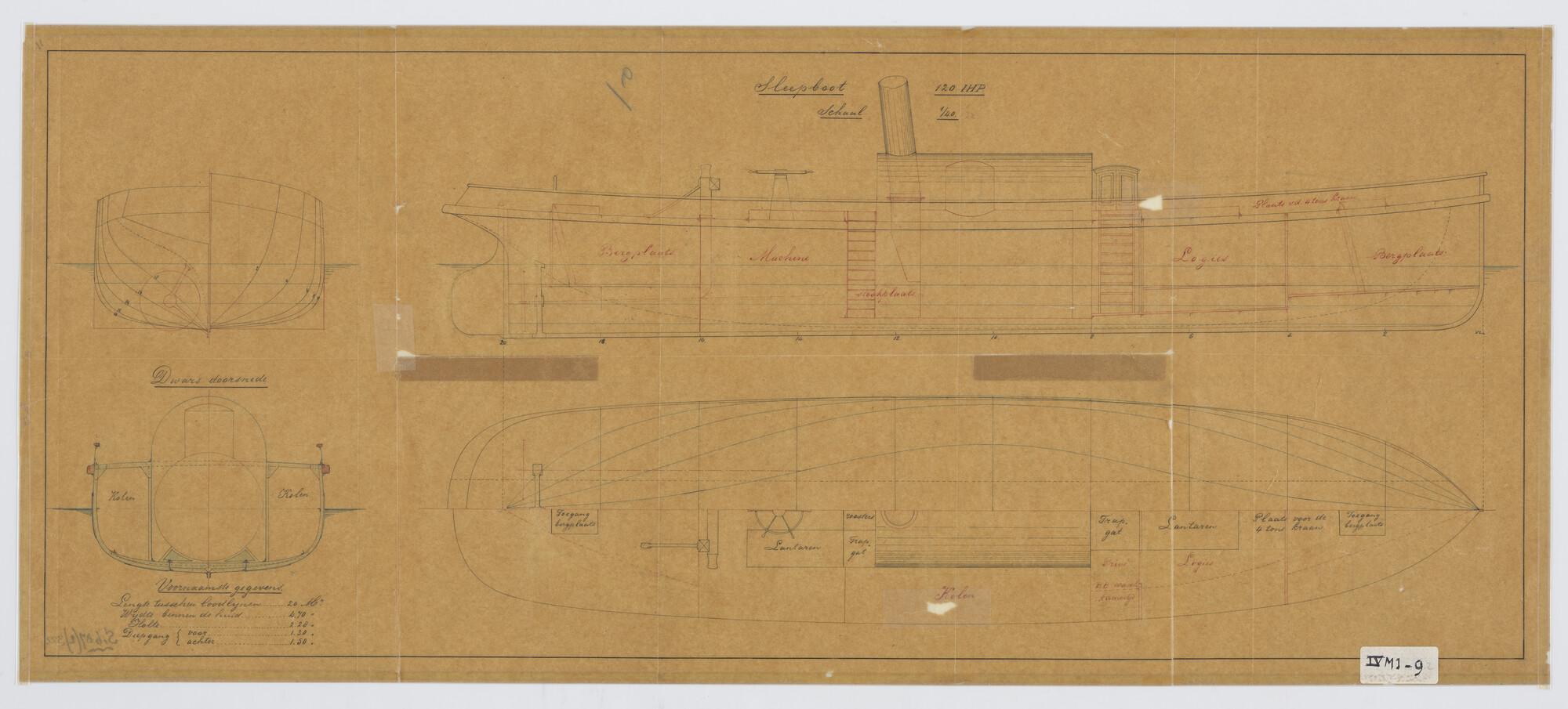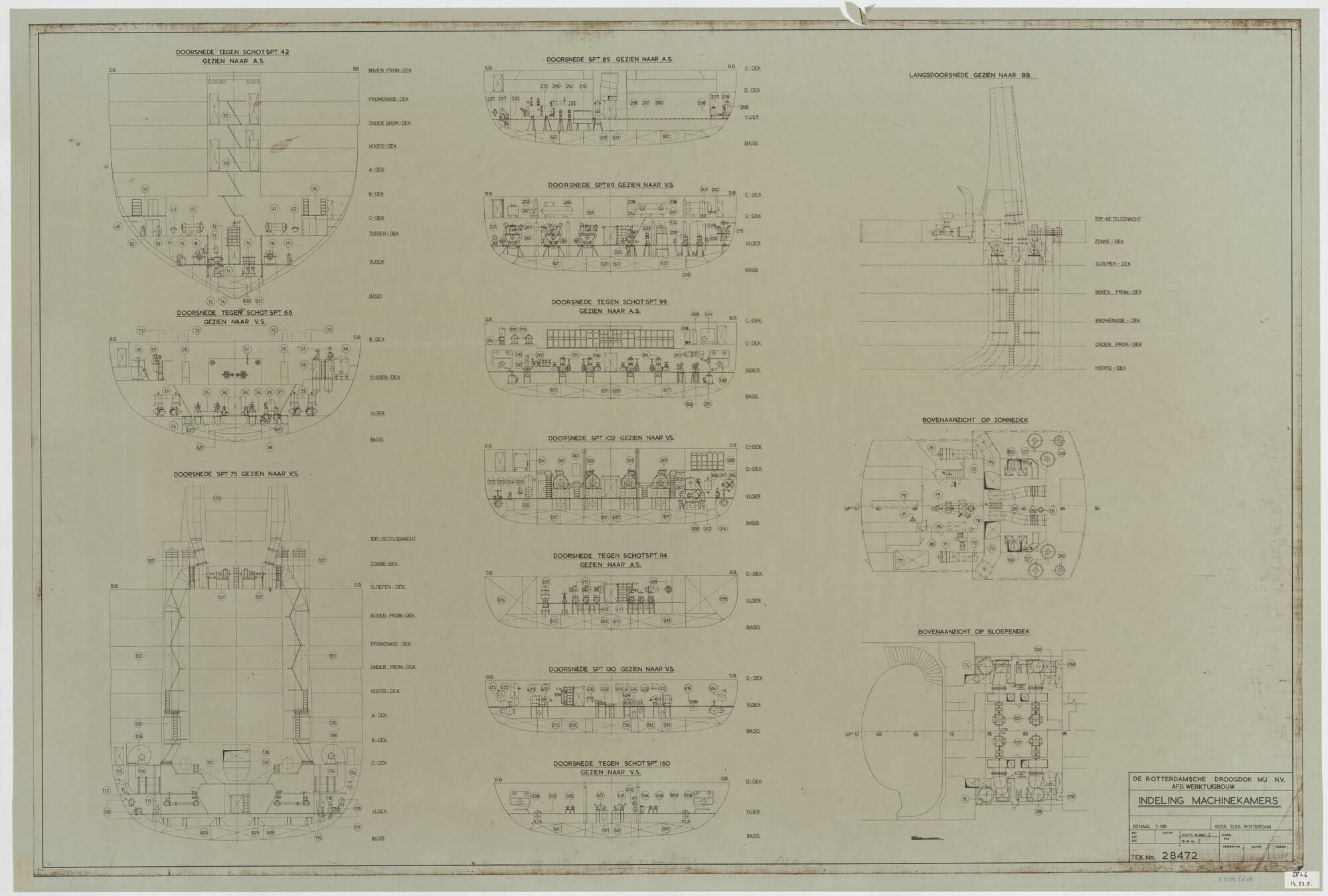 Verticale langsdoorsnede, bovenaanzicht, spantenraam...