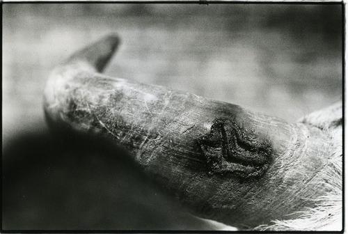 Foto in zwart-wit van de horen van een koe met brand...