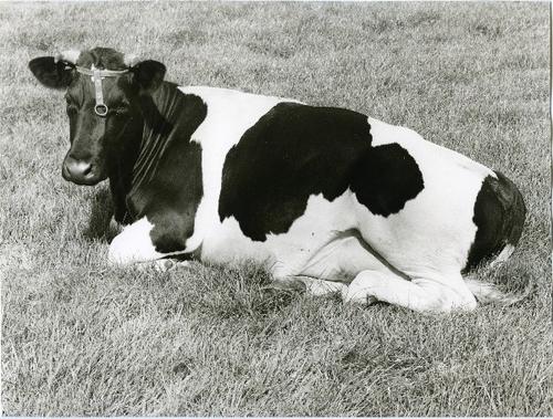Foto in zwart-wit van een liggende koe in het weilan...