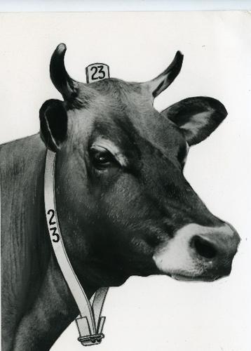 Foto in zwart-wit van een koe met halsband