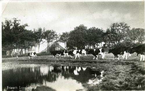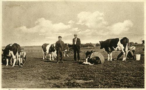 Prentbriefkaart in zwart-wit van koeien en een melkm...