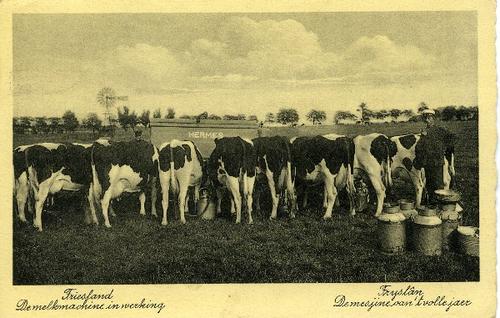 Prentbriefkaart in zwart-wit van het machinaal melke...